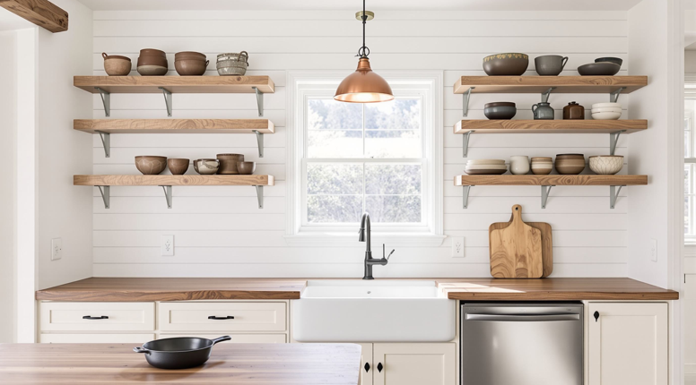 - Choose neutral dishware and keep it visible on open shelving.