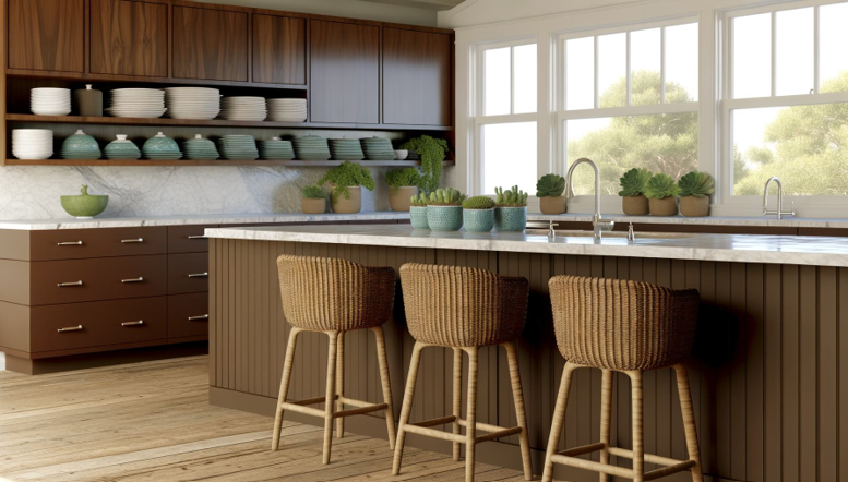 - Play with color: Add turquoise, mustard, or burnt orange accents through bar stools, backsplash tile, or small appliances.